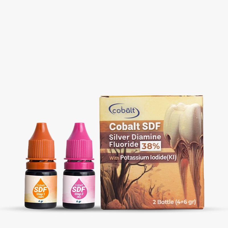 SDF کبالت ماده ای حاوی نقره و فلوراید است که به عنوان عامل ضد حساسیت در پوسیدگی های عاجی استفاده می شود. این محصول همچنین می تواند به عنوان متوقف کننده پوسیدگی های شدیدا پیش رونده (rampant caries) استفاده شود. محلول بطری دوم در این محصول حاوی پتاسیم یداید است که میتواند در صورت استفاده صحیح باعث کاهش تغییر رنگ در دندان شود. موارد استفاده: توقف پوسیدگی های سریع پیش رونده رفع حساسیت عاج سرویکال